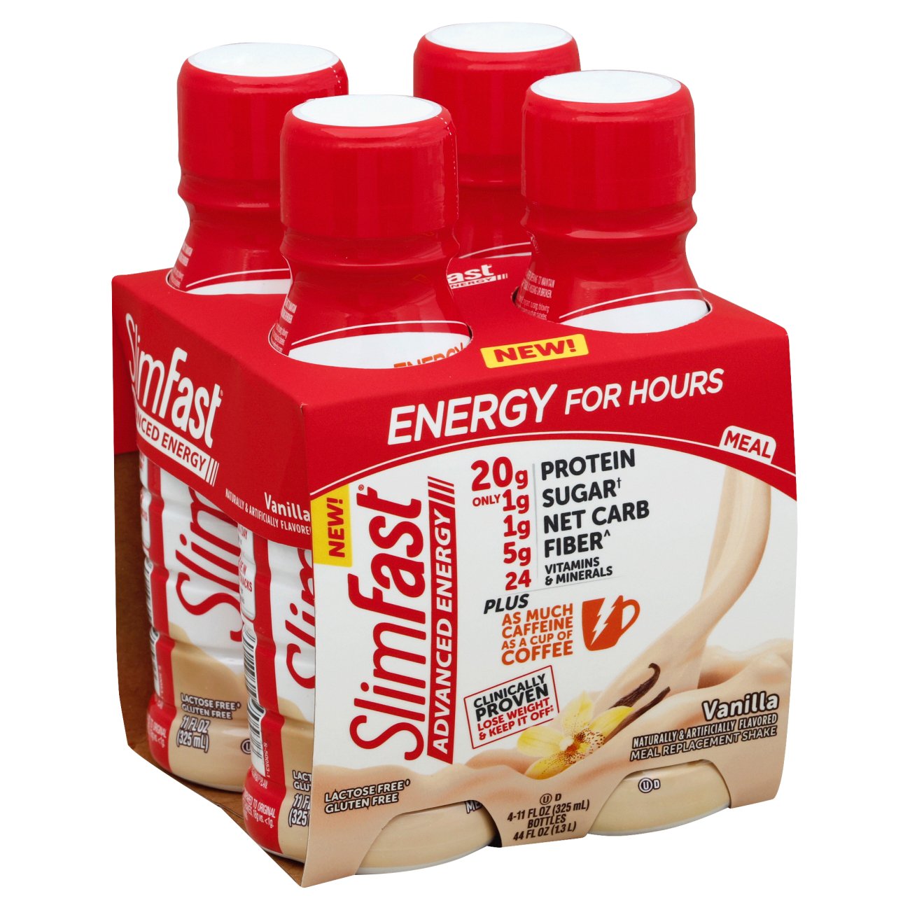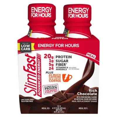 Read label prior to use. Give your weight loss an energy boost with slimfast advanced energy meal replacement shakes. Combine with three low calorie slimfast snacks and one sensible meal of your choice. 43 fat 15 carbs 42 protein.